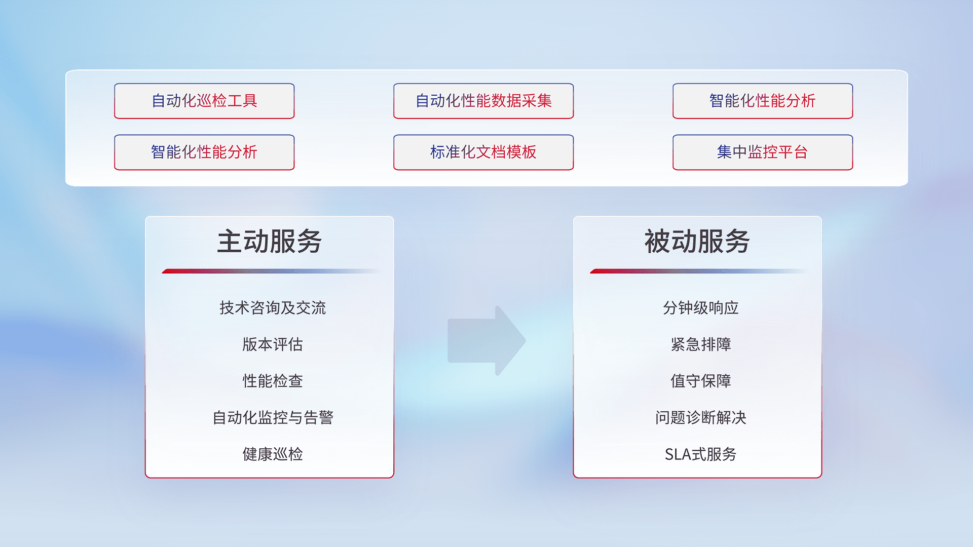 智能化工具和标准化文档,,,保障服务质量,,,,提供主动服务(包含技术咨询、、版本评估、、、性能检查、、、、自动化监控与告警、、、健康巡检)和被动服务包含(分钟级响应、、、、紧急排障、、值守保障、、问题诊断解决、、SLA服务)。。。。